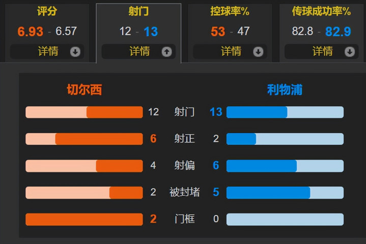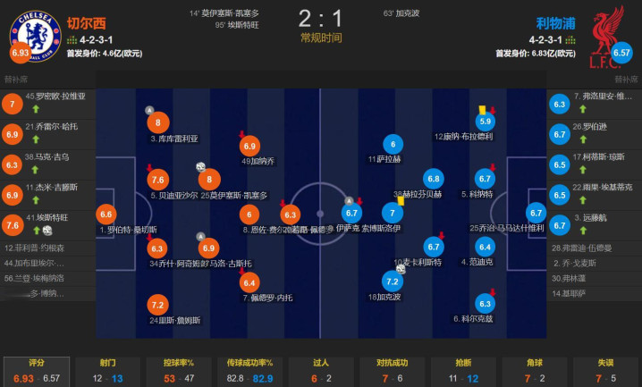 全场比赛稳拿证券,切尔西的控球率为53%,一共有12次射门,其中6次射正;利物浦一共有13次射门,其中仅有2次射正。